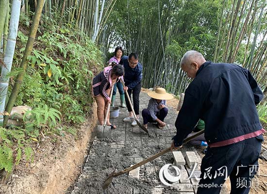 吳軍(左三)和村民一起鋪設龍女泉步行道。浦北縣脫貧攻堅信息宣傳辦供圖
