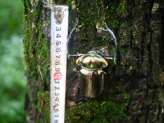 陽彩臂金龜(Cheirotonus jansoni)隸屬金龜科(Scarabaeidae)彩臂金龜屬(Cheirotonus Hope),為大型甲虫,是國家二級重點保護野生動物,因獨特的外形和稀有的數量,被譽為“昆虫界大熊貓”。作為中國最珍稀的甲虫之一,陽彩臂金龜被列入《中國國家重點保護野生動物名錄》,在《世界自然保護聯盟》(IUCN)中保護級別為瀕危(EN)。該物種曾於1982年被宣布在中國滅絕,2004年在江西被重新發現。其體型龐大,色彩艷麗,雄性前足特別長大,軀體在陽光照射下閃閃發光,導致人為捕採嚴重,野外生存數量越來越少。同時,賴以生存的森林環境遭到大面積破壞,生存空間被極度壓縮,也是導致其瀕臨滅絕的主要原因。