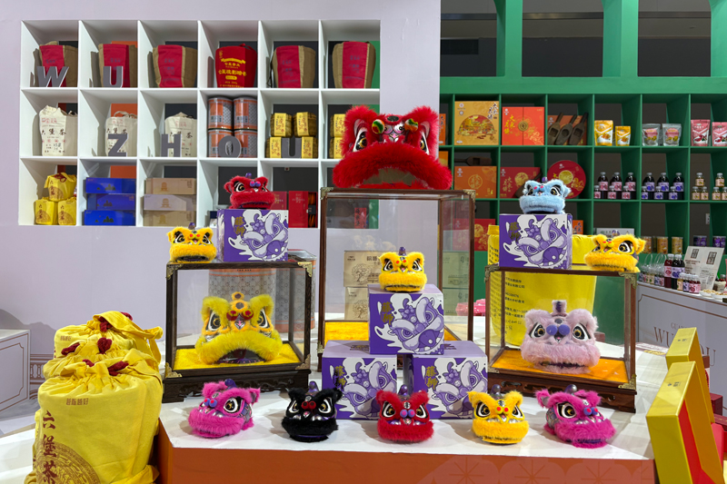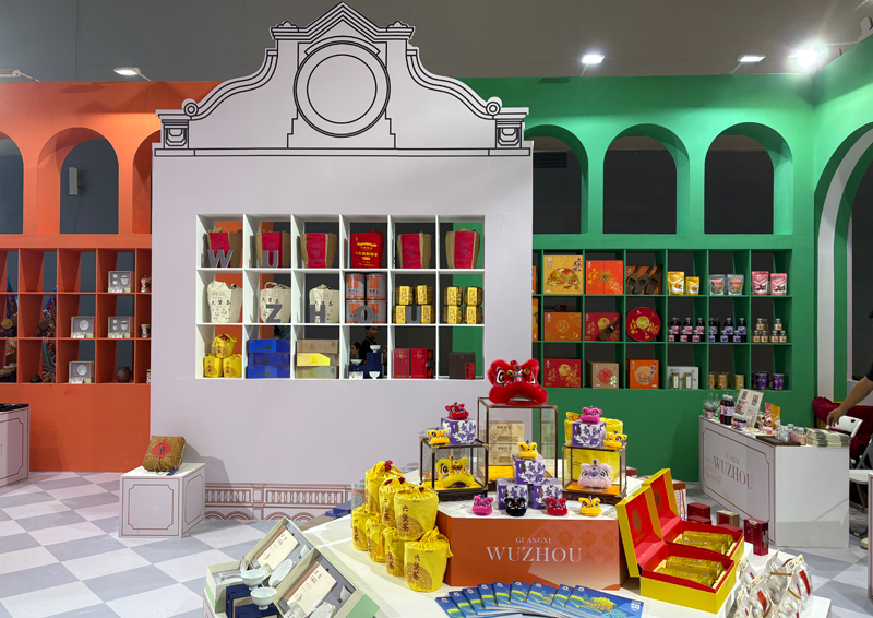 漫步百年騎樓,探尋嶺南古韻。今年,梧州展館創新採用騎樓造型,拱形窗門化身一個個展架率先映入眼帘,吸引游客前來沉浸式參觀。梧州市文廣體旅局精心策劃,積極組織該市文旅企業踴躍參展,既有六堡茶、龜苓膏、大東月餅等“老字號”商品,也有中和瓷、獅舞文創、金砂玉等文化旅游產品以及玫瑰醋、鴨腳木蜂蜜、百香果干等縣域名優特產,打造了一個“可逛、可吃、可玩”的展示平台。豐富的特色產品亮眼吸睛,生動展示了梧州文旅產業的多元魅力與創新活力。