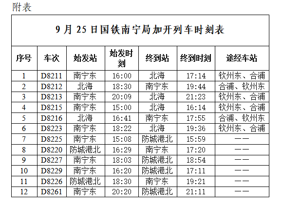 為方便旅客出行,國鐵南寧局25日加開南寧東往返於北海、欽州東、合浦、防城港北等方向12趟動車。(加開列車詳情見附表)鐵路部門后續會根據天氣變化情況動態調整列車運行方案,有出行計劃的旅客出行前請關注鐵路12306官方網站及車站公告,第一時間掌握列車開行信息,合理安排出行。(王勇、景飛飛)