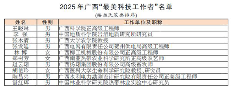 廣西科學院正高級工程師王曉琳致力於人工智能、傳感技術與智能機器人研究工作,科研成果廣泛應用於“中國天眼”、港珠澳大橋、埃及REF橋等國內外500余項重大工程﹔中國地質科學院岩溶地質研究所研究員李強致力於破解全球碳循環難題。他帶領團隊解決學界關於“岩溶碳匯穩定性問題”的長期爭論,為我國將岩溶碳匯納入雙碳戰略提供核心科學依據﹔廣西大學農學院教授張木清致力於破解蔗糖產業發展難題。他帶領團隊完成全球首個現代栽培甘蔗中蔗1號染色體水平的基因組組裝,被國際同行譽為“甘蔗研究的新裡程碑”﹔廣西電網有限責任公司賀州供電局高級工程師張發延主持研發48項創新成果,獲22項國家專利,推動電網數字化轉型升級﹔廣西柳工機械股份有限公司正高級工程師林博主持開發的工程機械石墨烯潤滑劑關鍵技術,攻克納米材料在復雜工況下穩定分散的瓶頸,解決工程機械長期存在的磨損、異響、抖動等行業難題﹔廣西南亞熱帶農業科學研究所正高級農藝師鄭樹芳帶領團隊選育出堅果新品種“桂熱1號”,實現我國澳洲堅果自主選育零的突破,為廣西堅果產業奠基﹔廣西揚翔集團股份有限公司高級畜牧師趙雲翔創新構建智能化基因組育種體系,種豬年遺傳進展顯著提升﹔廣西醫科大學生命科學研究院教授、研究員胡艷玲領銜開發“HiOmics”一站式生信雲平台,實現“一鍵式”多組學分析,為臨床檢測及科學研究提供高效的生物信息分析技術支持﹔廣西水利電力勘測設計研究院有限責任公司正高級工程師陶昌弟參與構建“五網共建、多能融合”的廣西水網總體格局,為全國水網建設貢獻“廣西智慧”﹔中國林業科學研究院熱帶林業實驗中心研究員諶紅輝解決了南帶馬尾鬆用材林與高產脂林培育關鍵技術,突破珍貴樹種西南樺、光皮樺優良無性系的組培工廠化育苗技術,成果技術達到國內領先水平。