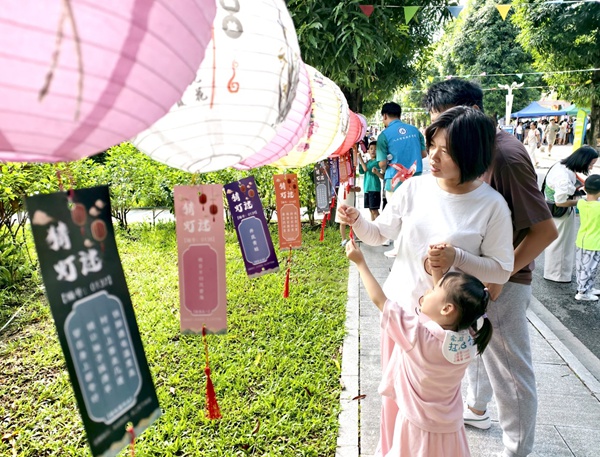 家長和孩子在中秋燈謎前凝神思考,領略漢字智慧。記者宋延康攝