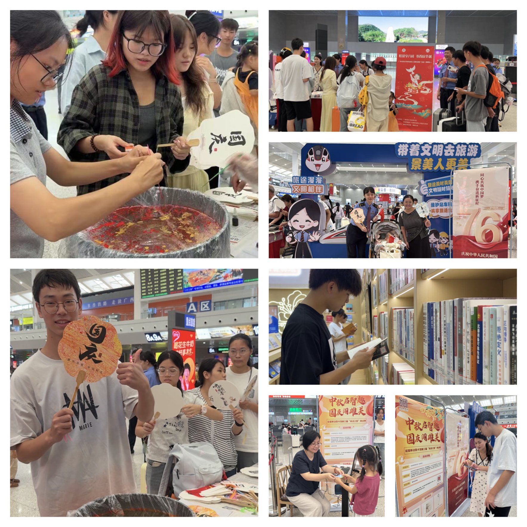 北海站通過“八桂文化快問快答”“強國知多少”問答環節、“愛國主題拓印”團扇制作和紅色主題表演等,形成充滿家國情懷與文化底蘊的旅途體驗﹔“抗戰主題圖書展”精選愛國主題讀物與八桂文化典籍,更增添濃厚的文化氣息。防城港北站以豐富多樣的形式點燃旅客的愛國熱情,通過“愛國主義主題圖書展”、16枚地方文旅印章收集、愛國主義詩歌朗誦和留言活動營造濃厚氛圍﹔當《我和我的祖國》旋律響起,旅客齊聲合唱將活動推向高潮。貴港站重點推介《讓歷史照亮明天》等精選黨史書籍,黨員干部、學生和旅客共同朗誦國慶主題詩歌﹔“詩詞飛花令”圍繞“家、國”等關鍵詞展開,國慶主題燈籠制作和《歌唱祖國》紅色歌曲快閃增強愛國氛圍。賀州站為少年兒童策劃“盛世中華”“東方巨龍”“強國少年”“大國成就”“共慶華誕”等活動環節,激發愛國情懷、培養民族文化認同感。崇左南站精心布置革命歷史、英雄傳記等優質電子書展,實現“即掃即讀”﹔“國慶知識有獎競答”和“閱讀感悟分享牆”讓旅客重溫國家發展歷程、書寫對祖國的祝福。