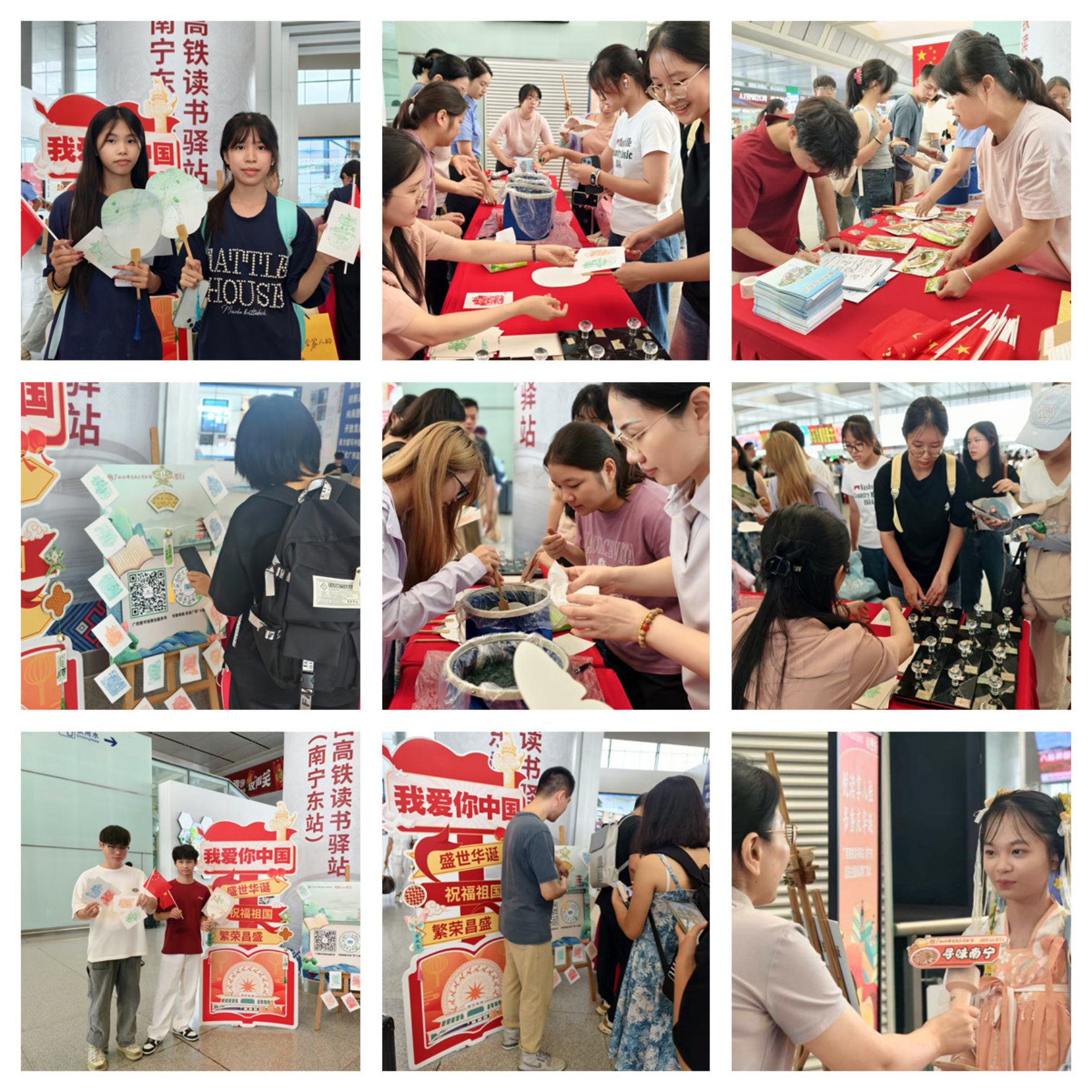 南寧東站設置“尋味南寧”美食趣味問答,帶領旅客了解老友粉、檸檬鴨等特色美食背后的文化故事,同步開展借書証辦理、“打卡集章”和“書香鐵路 走讀廣西”小程序推廣,實現便民服務與文化傳播結合。梧州南站創新推出“書香+健康”互動體驗,聯合梧州醫學高等專科學校的學生,現場分享紅色經典、朗誦詩文,並提供血壓測量、放鬆操教學、中藥香囊贈送及常見中藥材養生功效講解。欽州站為旅客獻上充滿趣味與創意的文化活動,旅客在“詩詞飛花令”環節對出精美詩句,引來陣陣喝彩﹔“Emoji書名猜猜樂”吸引旅客開動腦筋競相猜題,“掃一掃,把書本帶回家”則讓電子閱讀更便捷。在玉林北站,游客可掃碼參與融合紅色經典與真武閣、容縣沙田柚、玉林牛腩粉等當地文旅元素的知識競答﹔同步開展中國結編制體驗,親手制作寓意吉祥的中國結獻禮祖國。在河池西站,孩子們在“益智DIY”環節發揮想象力和動手能力,將尋常貝殼變成一幅幅充滿童真的藝術作品﹔在“文化體驗”環節認真執筆,在竹簡上抄寫詩詞,展現古今文化交融。