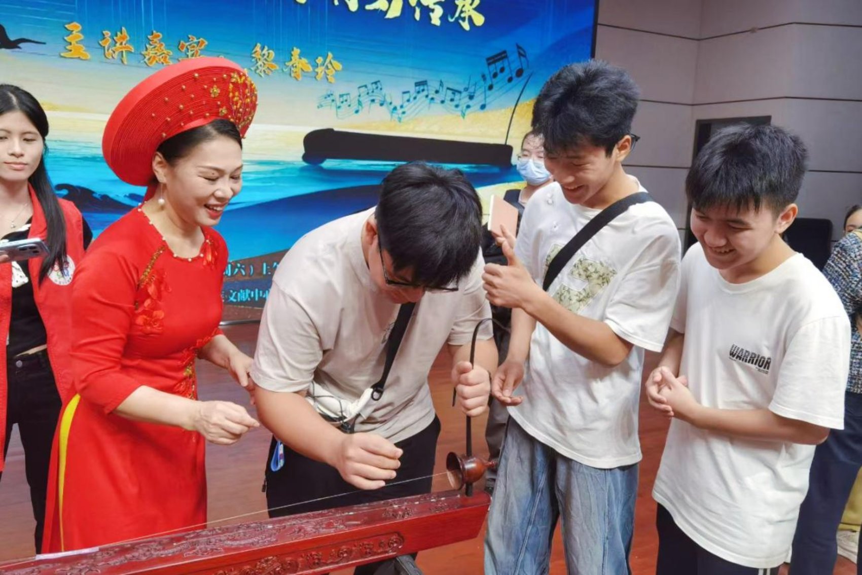 在活動的尾聲,黎老師現場教學,帶領觀眾用京族語言學唱民歌《過橋風吹》。大家踴躍跟學,輕快的旋律將現場化作一片歡樂的海洋。講座結束后,聽眾意猶未盡,紛紛上台體驗獨弦琴的彈奏,並就京族服飾、節日習俗等與黎老師展開熱烈交流。一位觀眾感慨道:“以前隻在書中讀到京族文化,今天能親手觸碰獨弦琴、學唱民歌,感覺特別親切!”
