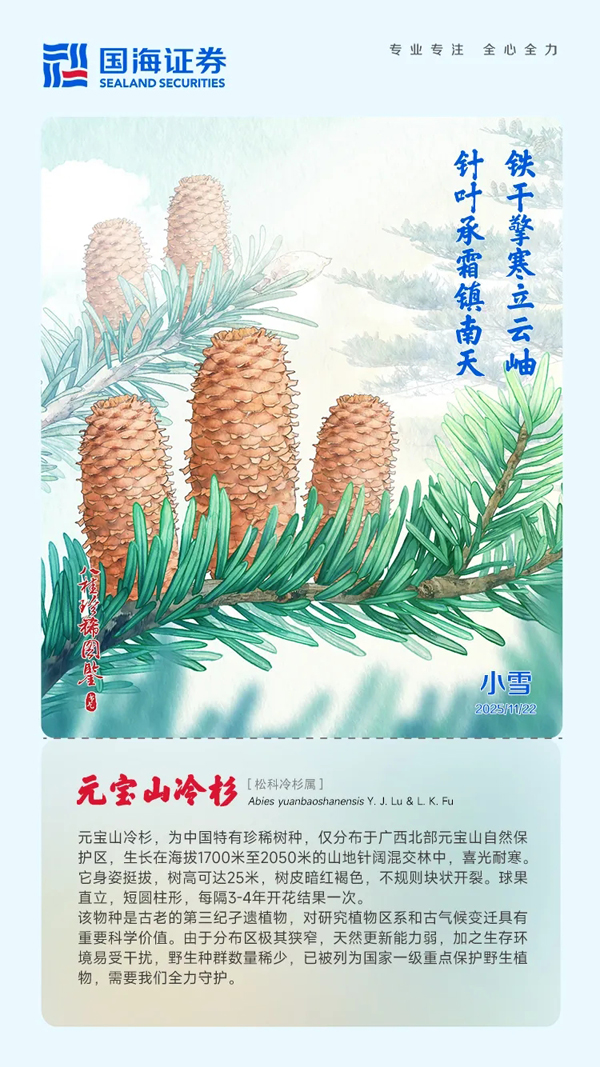小雪至,萬類藏形。元寶山冷杉,作為珍稀瀕危的古老殘遺物種,現存僅百余株,多為百年古木。它以獨特的基因密碼,記錄著地球氣候變遷與生命演化的史詩,成為植物區系研究和全球變化生物學領域的“科研遺珠”。面對種群繁衍的挑戰,科學的守護正延續這份珍貴的自然遺產,讓冰期生命的傳奇在嶺南山川間永續。