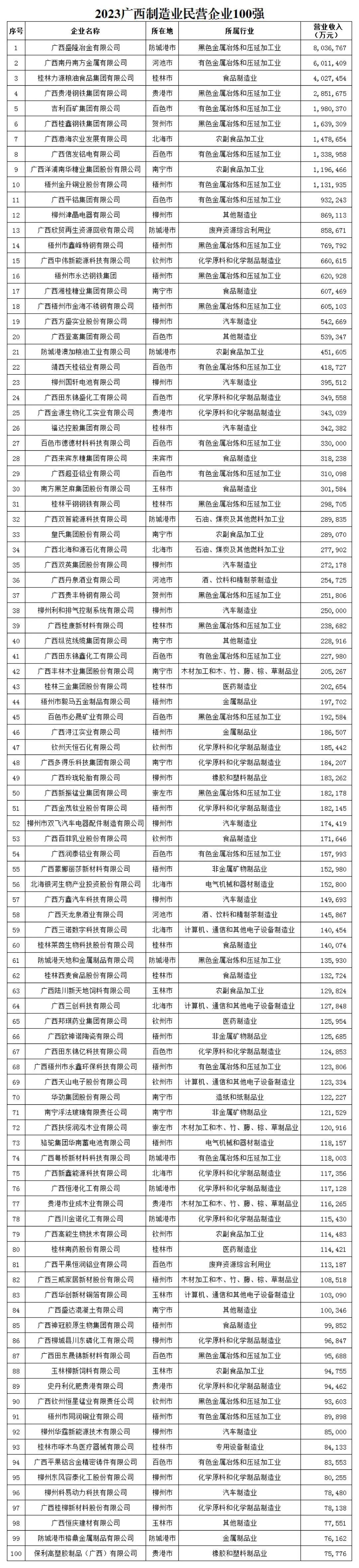 附2023广西民营企业制造业100强榜单: