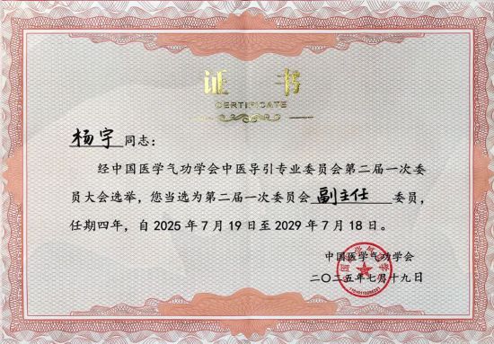 杨宇被推选为中国医学气功学会中医导引专业委员会副主任委员