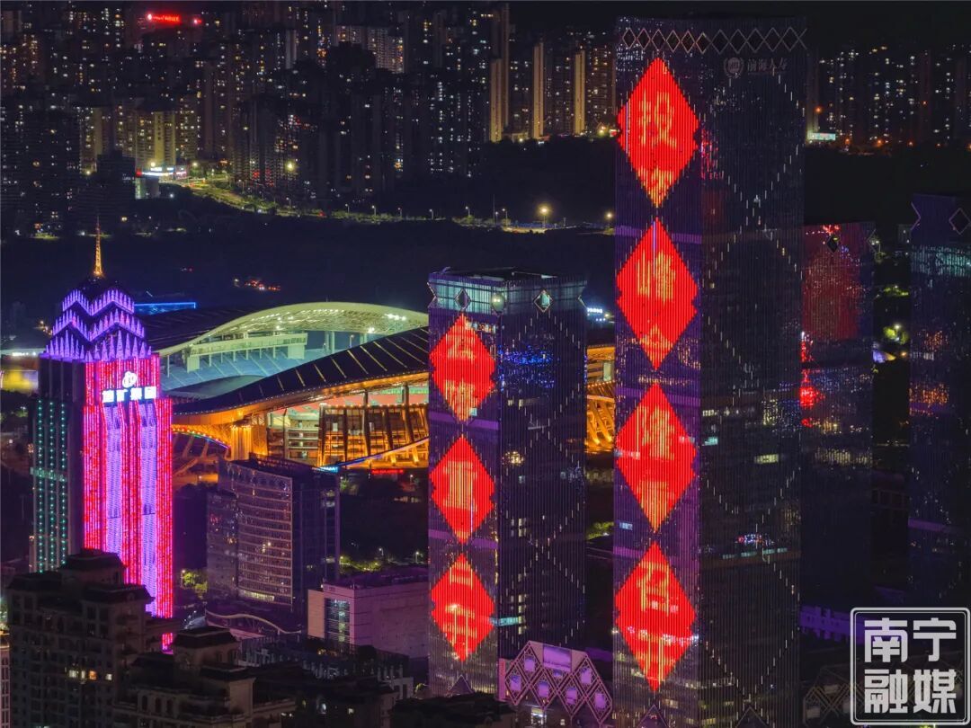 夜幕降临,华灯初上。南宁市多处市政设施开启霓虹灯、轮廓灯和彩灯,民族大道沿线、朝阳片区、邕江沿岸、五象新区等区域的标志性楼宇,几十座超高层建筑同步点亮,喜迎八方宾朋。