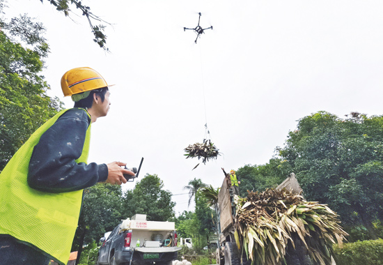 技术人员操纵无人机清运美人蕉枯叶。 记者宋延康摄