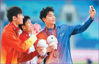 赛后,陈妤颉走到终点线附近,与立体电子屏上的“11秒10”合影,尽显少年意气。