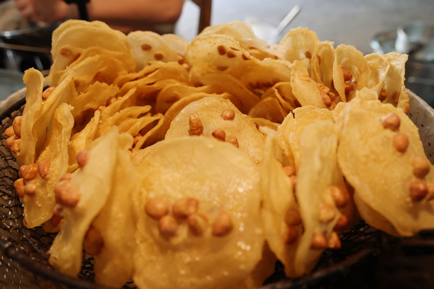制作地豆饼的师傅们要先将大米研磨成细腻的米浆,再撒上少许食盐调味,待油锅烧到一定温度之后,将模具放入锅中预热,在预热好的模具中倒入适量的米浆,轻轻摇晃两三下让其均匀延展,中间撒上几颗“地豆”,再平稳送入翻滚的油锅中,白花花的米浆遇热迅速定型,脱离模具在油中翻腾,此时需手持长筷精准把控时机与力度翻面,既要让饼身炸制均匀、色泽微黄,又要避免碎裂变形,刚出锅的地豆饼迅速放入簸箕晾凉,待油脂散尽后才能密封保存,看似简单的制作流程,实则藏着世代相传的技艺密码。