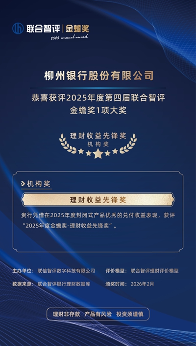 收藏近日,联合智评2025年度第四届“金蟾奖”评选结果重磅揭晓,柳州银行凭借2025年度封闭式理财产品优秀的兑付表现,从众多参评机构中脱颖而出,荣获“金蟾奖-理财收益先锋奖”!